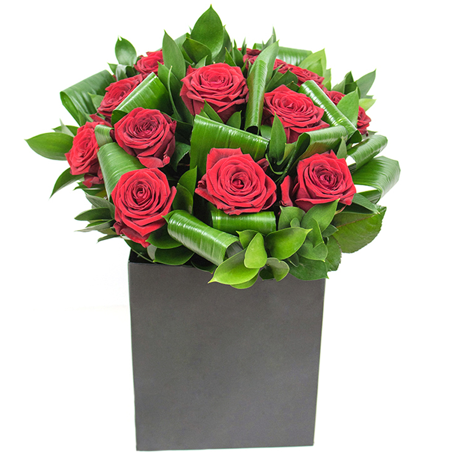 Elevate any space with our exquisite red rose bouquet, complemented by aspidistra leaves and ruscus. This artistically arranged bouquet offers a perfect blend of color and texture, making it a standout piece.